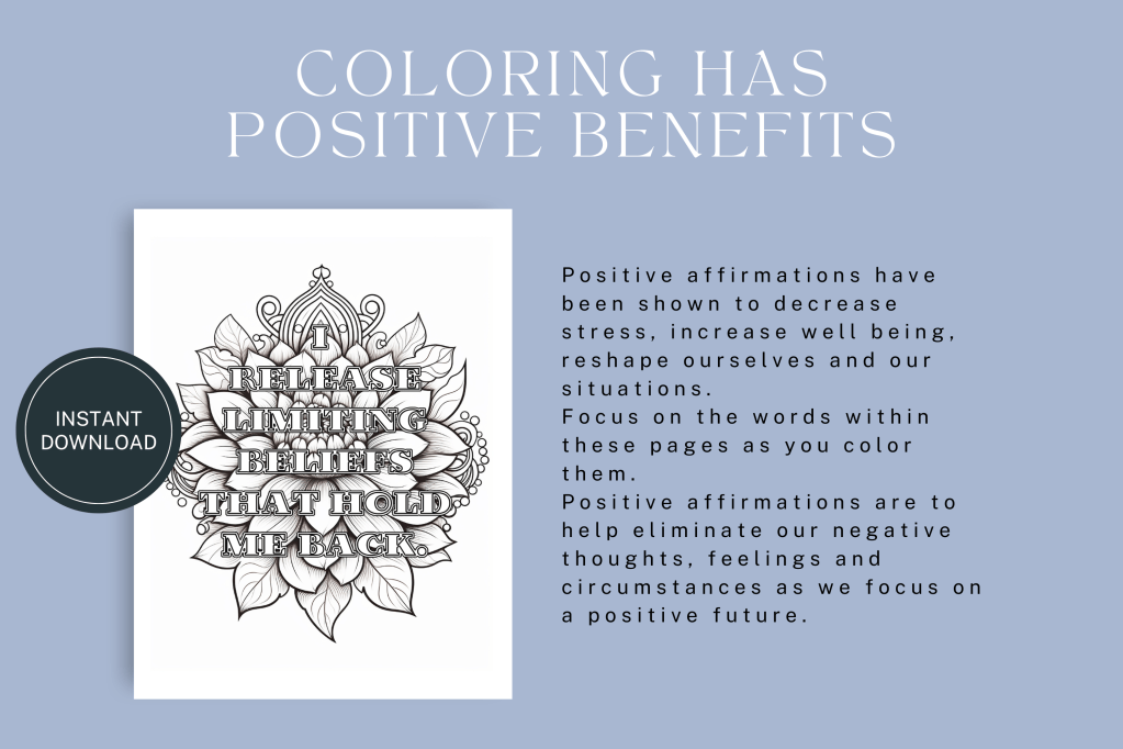Information on Benefits: Learn about the positive impacts of coloring and affirmations on your overall health.